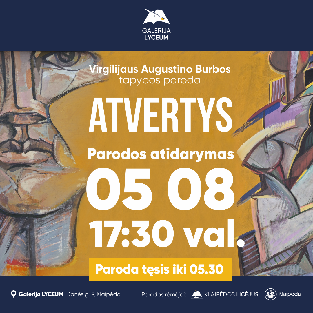 Gegužės 8 d.,17.30 val. galerijoje „Lyceum” atidarysime žymaus Klaipėdos krašto grafiko, dailininko, pedagogo Virgilijaus Augustino Burbos naujausių tapybos darbų parodą „ATVERTYS”!