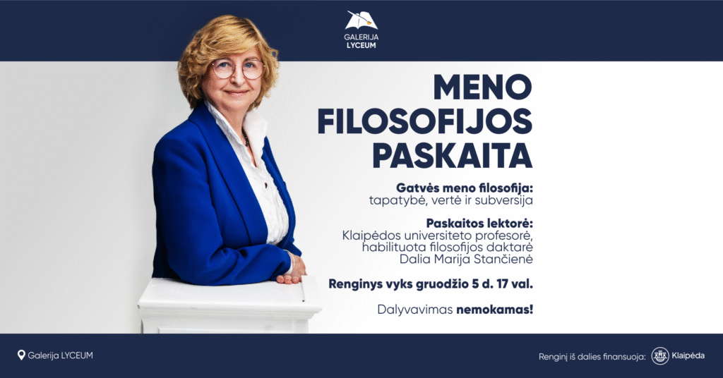 Gruodžio 5 d. 17 val. galerijoje „Lyceum“ (Danės g. 9, Klaipėda) vyks meno filosofijos paskaita „Gatvės meno filosofija: tapatybė, vertė ir subversija“ su Klaipėdos universiteto profesore, habilituota filosofijos daktare Dalia Marija Stančiene.